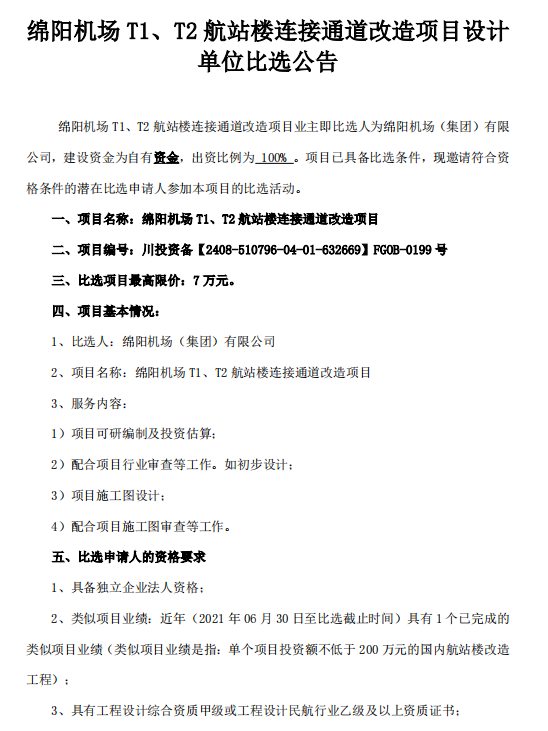綿陽機場 T1、T2 航站樓連接通道改造項目設計單位比選公告